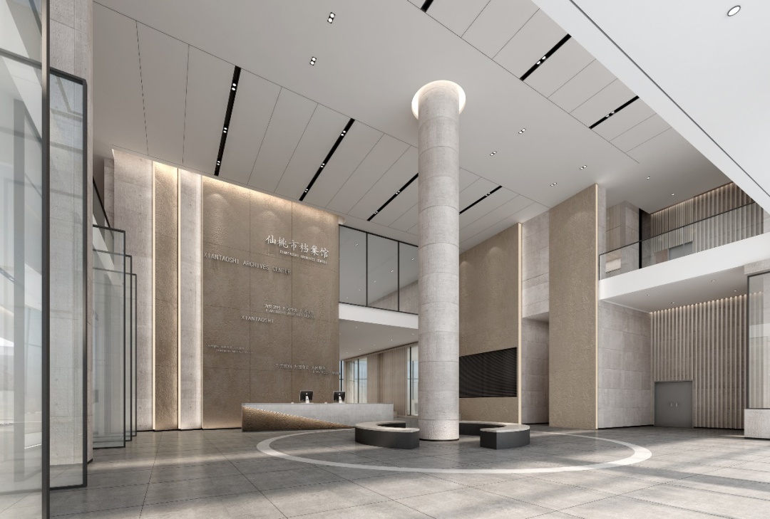 主背景墻設計靈感源于“紙張”“書本”,以大塊暖色文化石相互疊加,形成錯層。在“紙張”之上點綴文字。記載著仙桃市檔案館的宗旨和重要時刻。整體設計更加符合“檔案”理念。