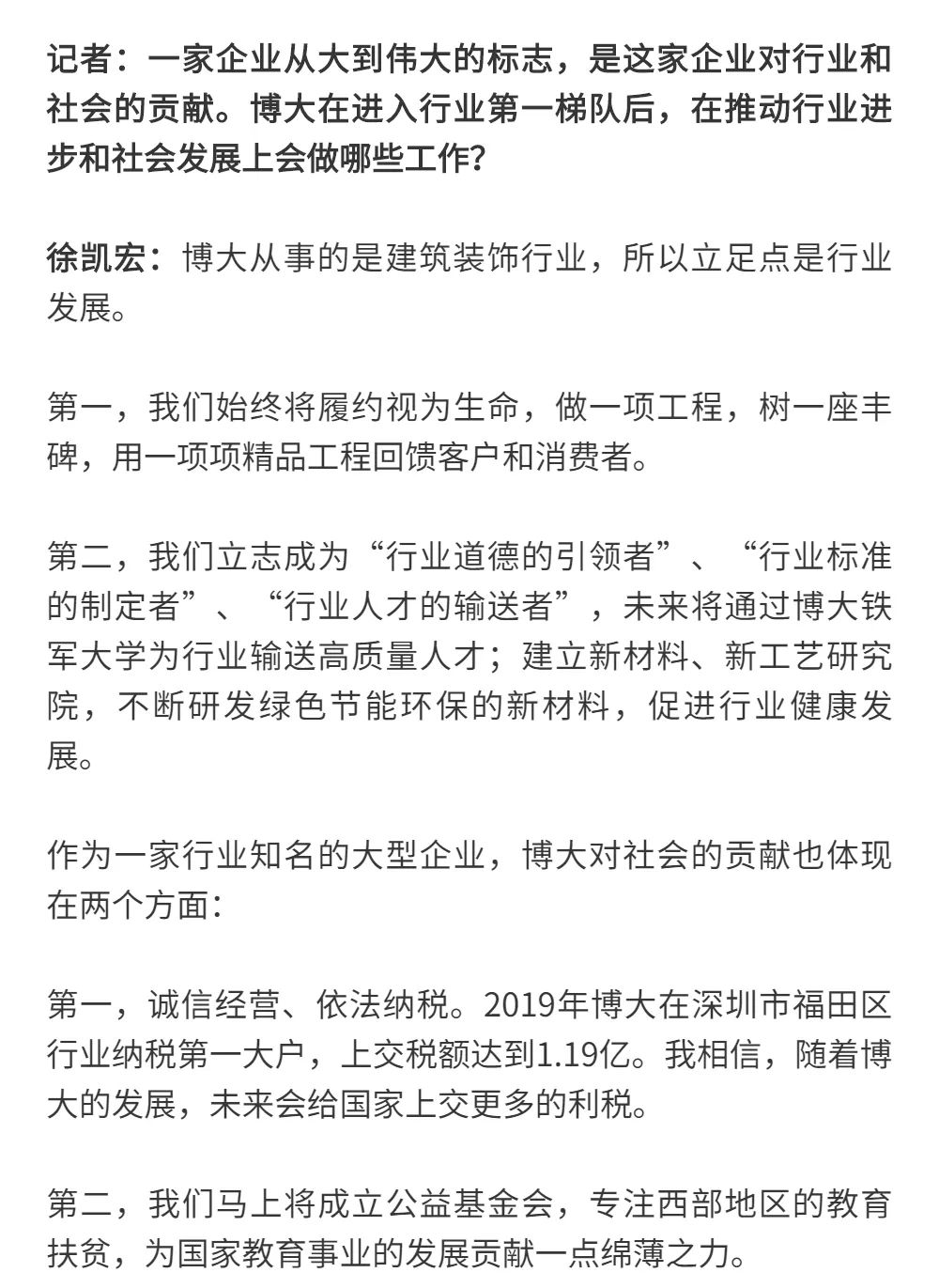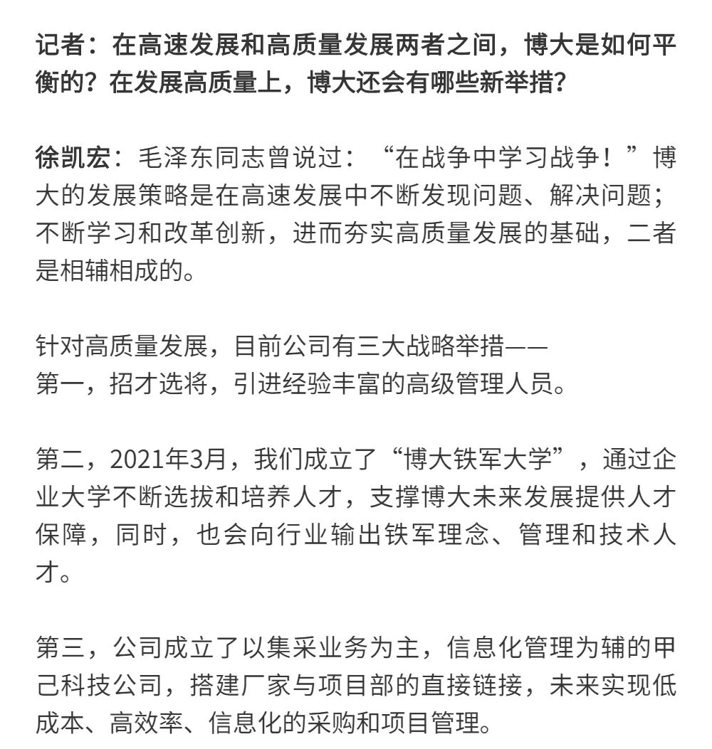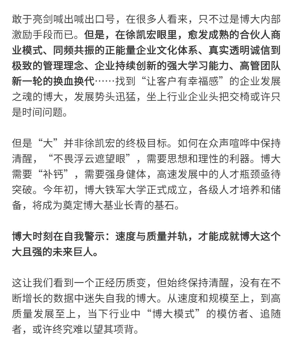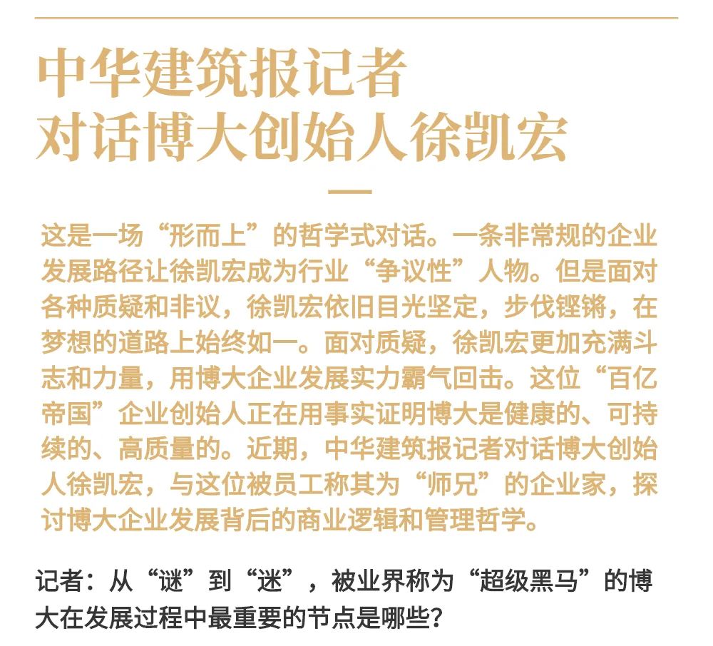 博大以雷霆之勢迅速崛起,吸引了行業(yè)的高度關(guān)注,行業(yè)權(quán)威媒體《中華建筑報》數(shù)次深入博大一線調(diào)研走訪,并對創(chuàng)始人徐凱宏先生進(jìn)行了坦誠的訪談,以探討和總結(jié)博大發(fā)展的秘籍,并寫就了《進(jìn)擊的博大:從高速到高質(zhì)量的創(chuàng)新逆襲》和《對話徐凱宏 | 博大正沿著高質(zhì)量發(fā)展道路堅定前行》兩篇文章。