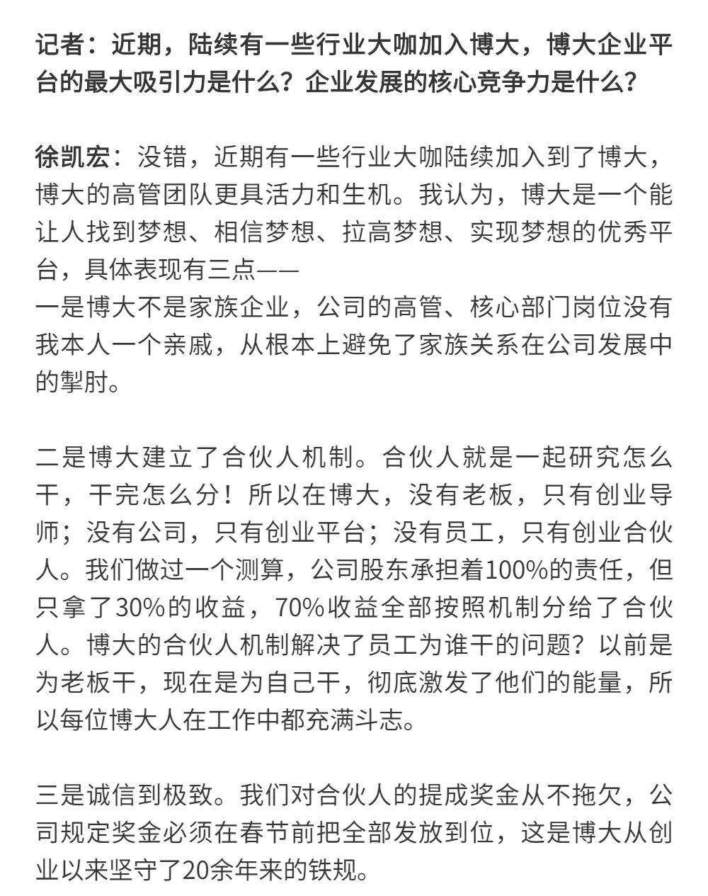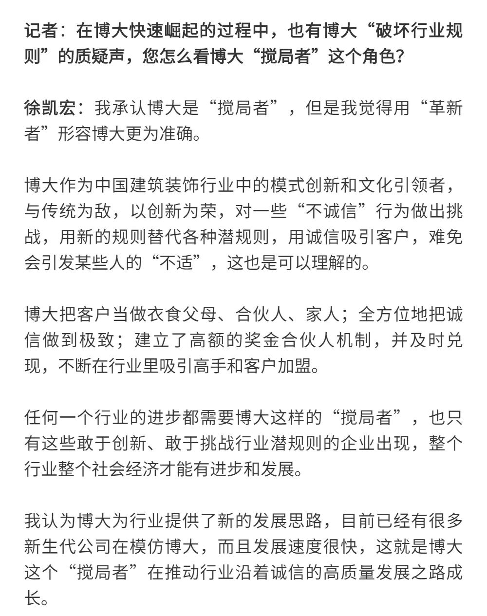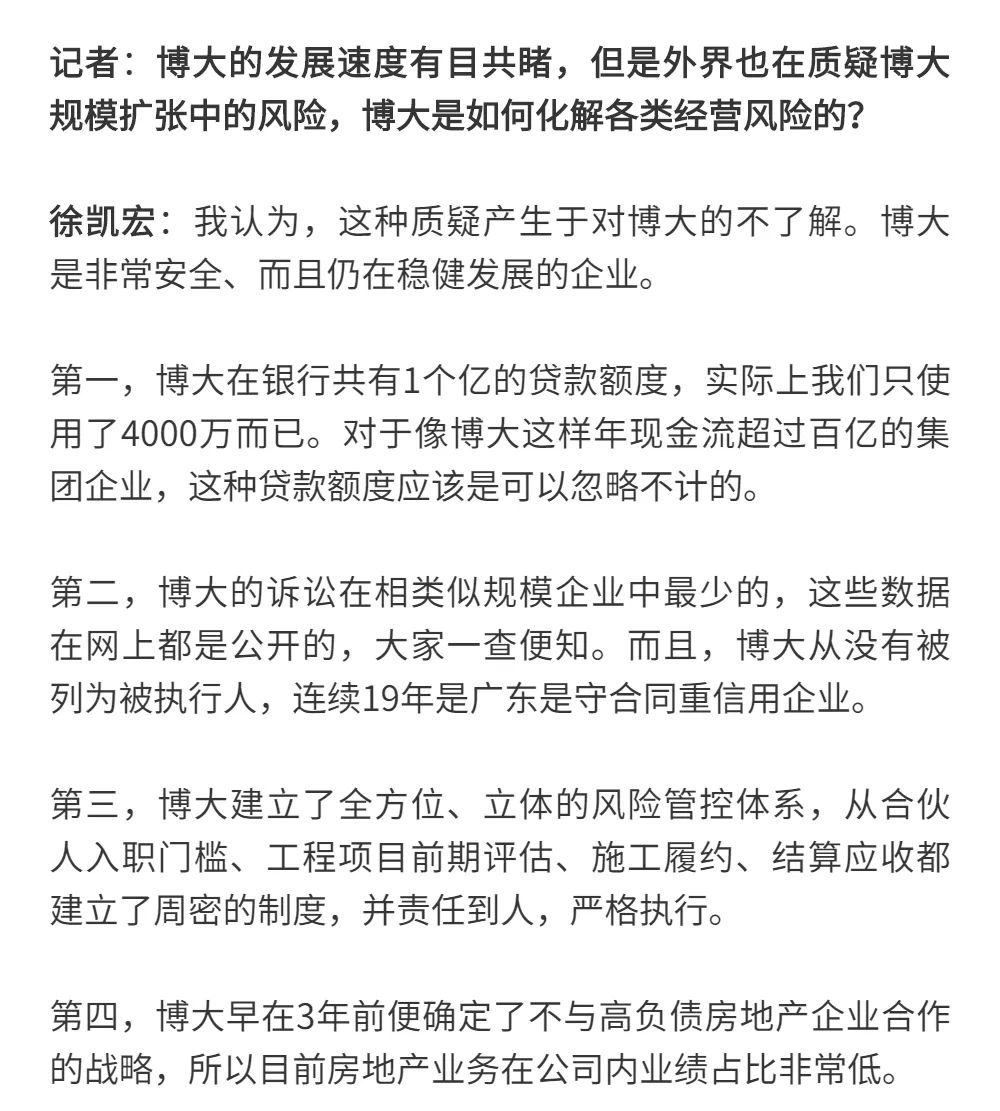 博大以雷霆之勢迅速崛起,吸引了行業(yè)的高度關(guān)注,行業(yè)權(quán)威媒體《中華建筑報》數(shù)次深入博大一線調(diào)研走訪,并對創(chuàng)始人徐凱宏先生進(jìn)行了坦誠的訪談,以探討和總結(jié)博大發(fā)展的秘籍,并寫就了《進(jìn)擊的博大:從高速到高質(zhì)量的創(chuàng)新逆襲》和《對話徐凱宏 | 博大正沿著高質(zhì)量發(fā)展道路堅定前行》兩篇文章。