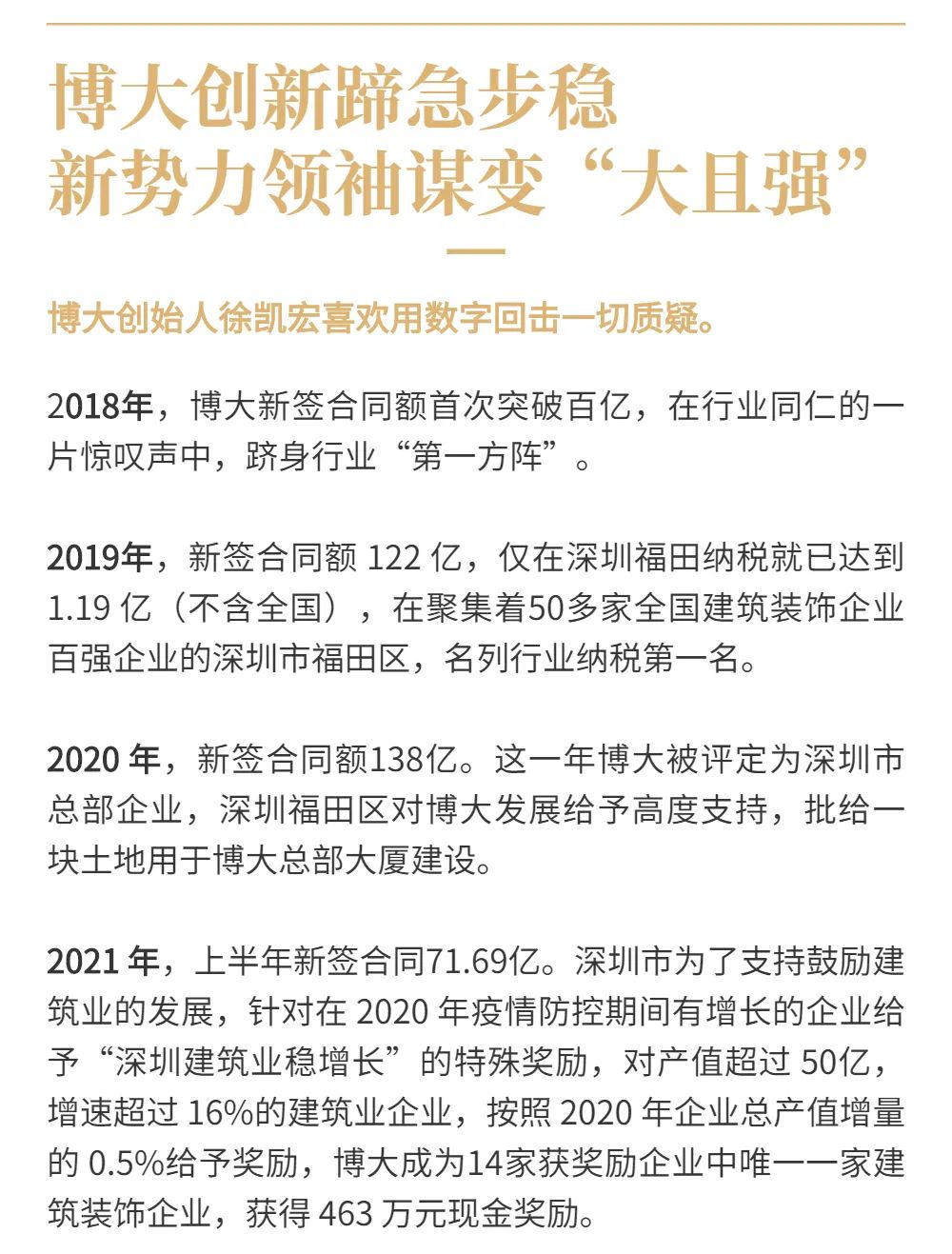 10年時間,博大業(yè)績實(shí)現(xiàn)了從10億到138億的高速增長,從默默無聞到行業(yè)知名,屢屢創(chuàng)造發(fā)展奇跡。2019年成為深圳市福田區(qū)行業(yè)排名第一的納稅大戶;2020年成為深圳市總部企業(yè);2021年榮獲深圳市政府建筑業(yè)穩(wěn)增長獎勵,成為行業(yè)唯一一家獲此殊榮的裝飾企業(yè)。