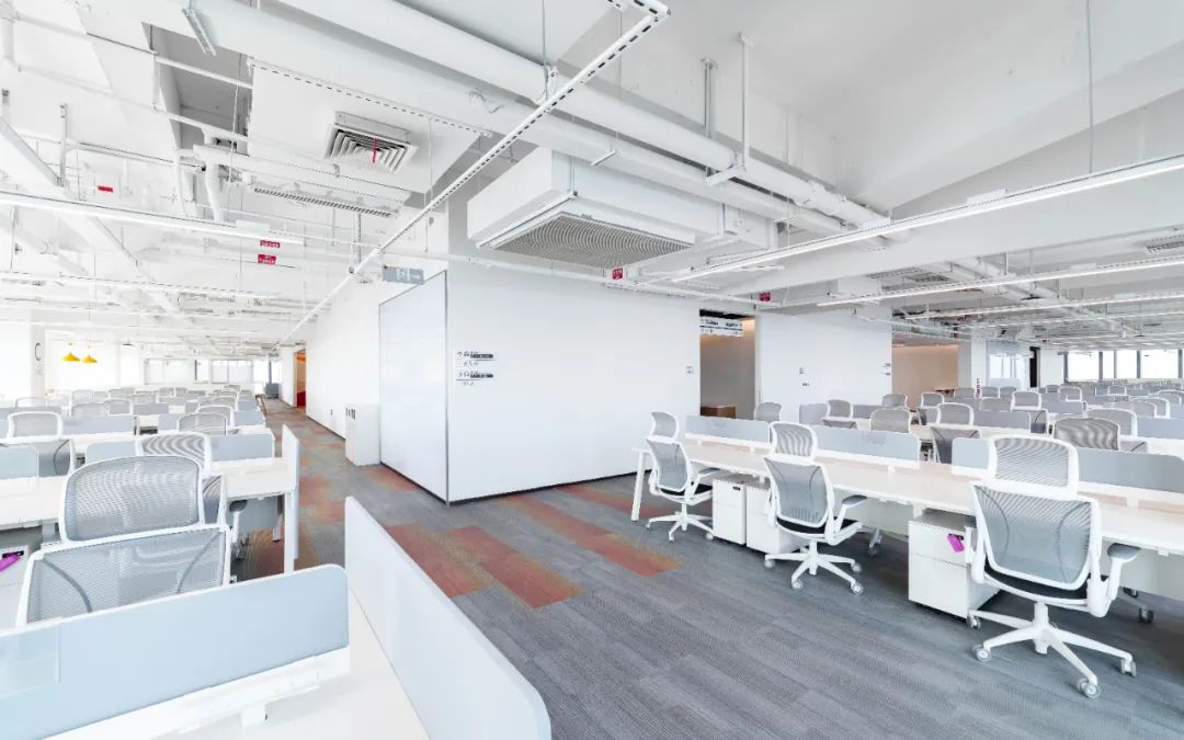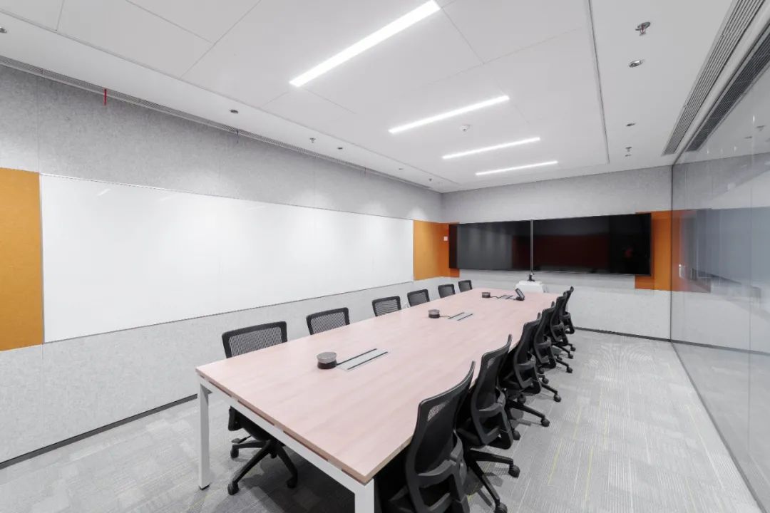 天花采用鋁方通格柵吊頂和開放式原頂噴涂,增加了平面導向性,提升了天花空間,降低了多種裝飾材料堆積造成的空氣污染,營造綠色環保的辦公環境。